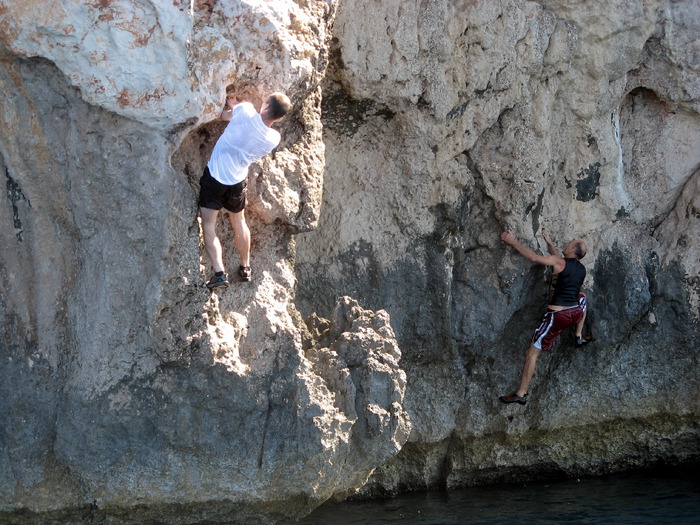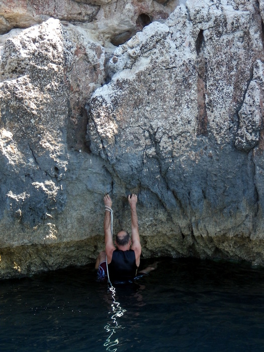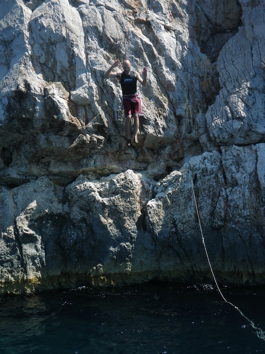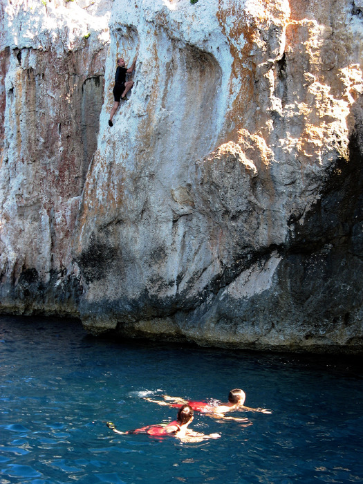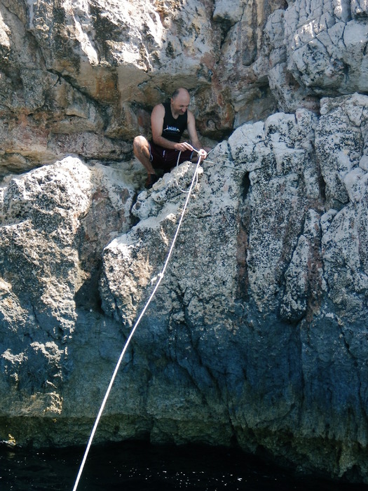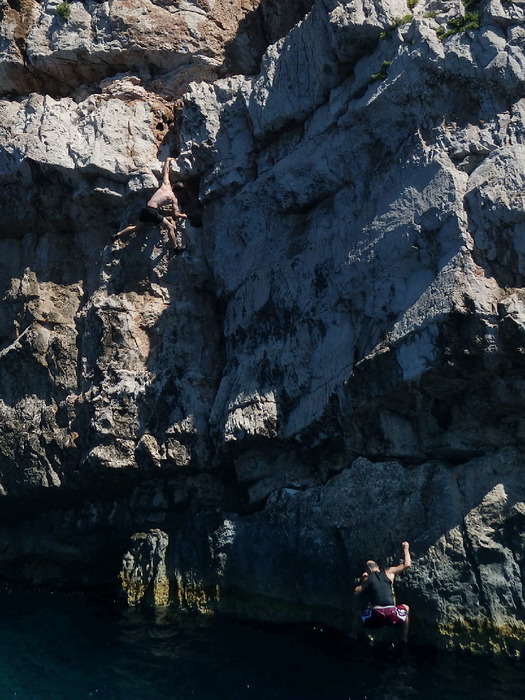 Deep water solo blizu Paklenice. Naša barka, naš kapetan, naše predivno more i naša bezgranična mašta u biranju najrazličitijih mogućih i nemogućih linija. Brod je samo na jednom mjestu i tek nakratko bilo moguće usidriti, dakle tamo gdje je more bilo najpliće – "svega" 80 metara dubine! :)