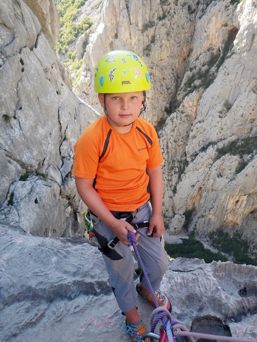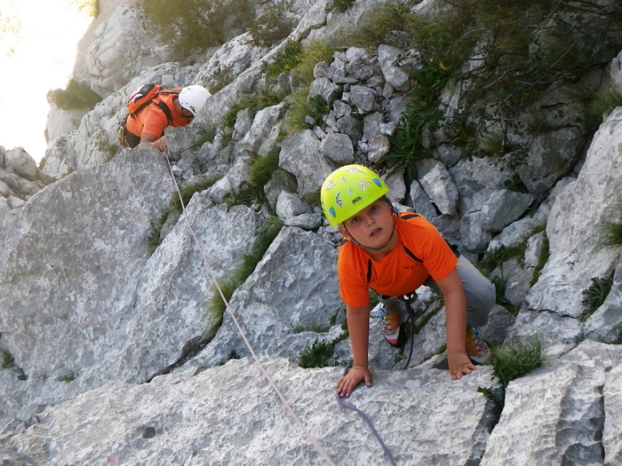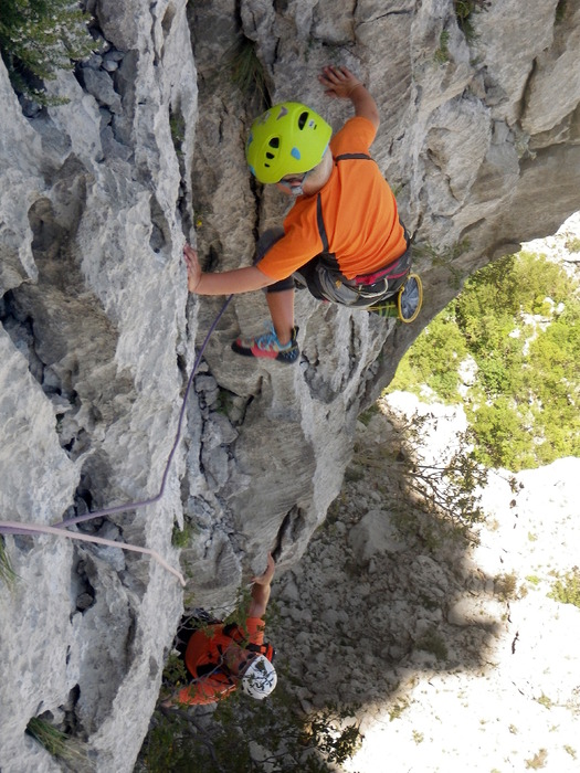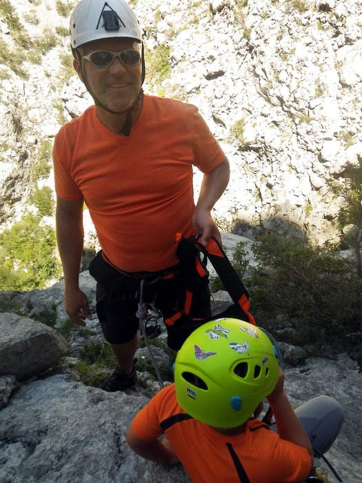 Dušan i Max u Paklenici. Divno je bilo penjati s našim gostima u Starigradu. U subotu smo popeli 200-metarnu kombinaciju smjerova Sjeverni greben + rebro. Mada smo na raspolaganju imali samo popodnevni termin, cijelo smo vrijeme penjali u hladu. Max je tako u stijeni proslavio svoj osmi rođendan!