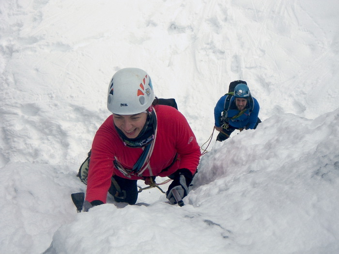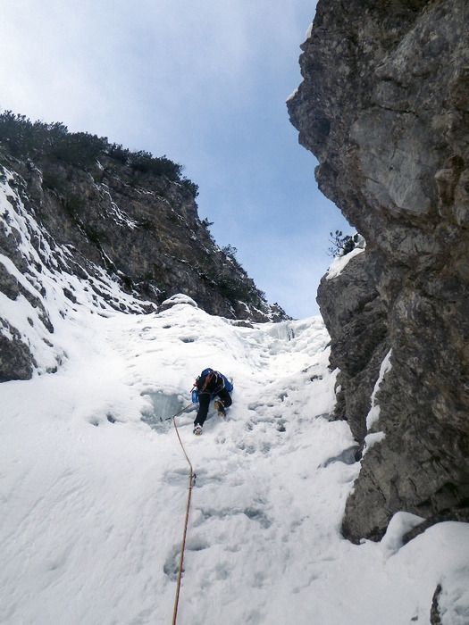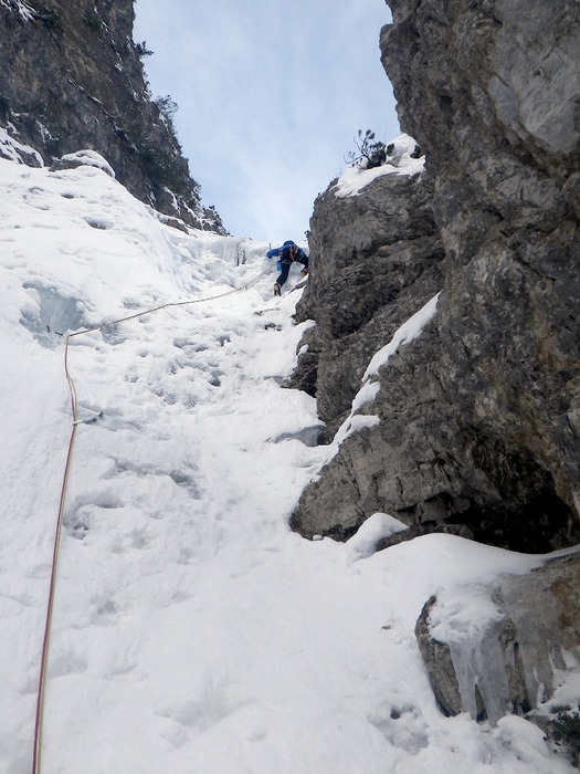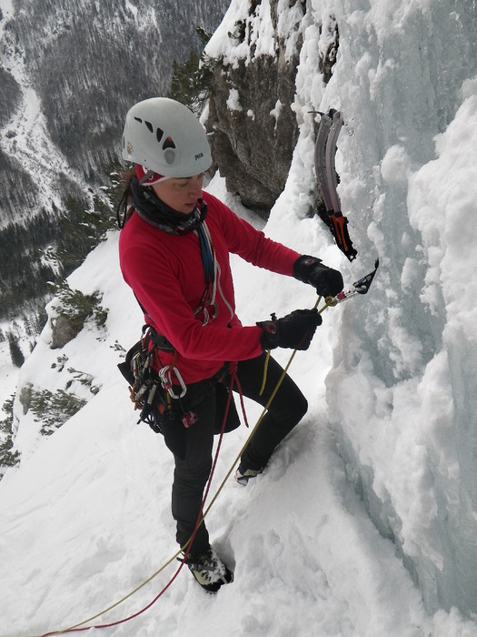 Dobar zalogaj leda u Prednjoj glavi Prisojnika. Drugi slap u izvedbi zimske alpinističke škole AOŽ bio je pravi pogodak. Dobar led, nešto snijega, odlično iskustvo!